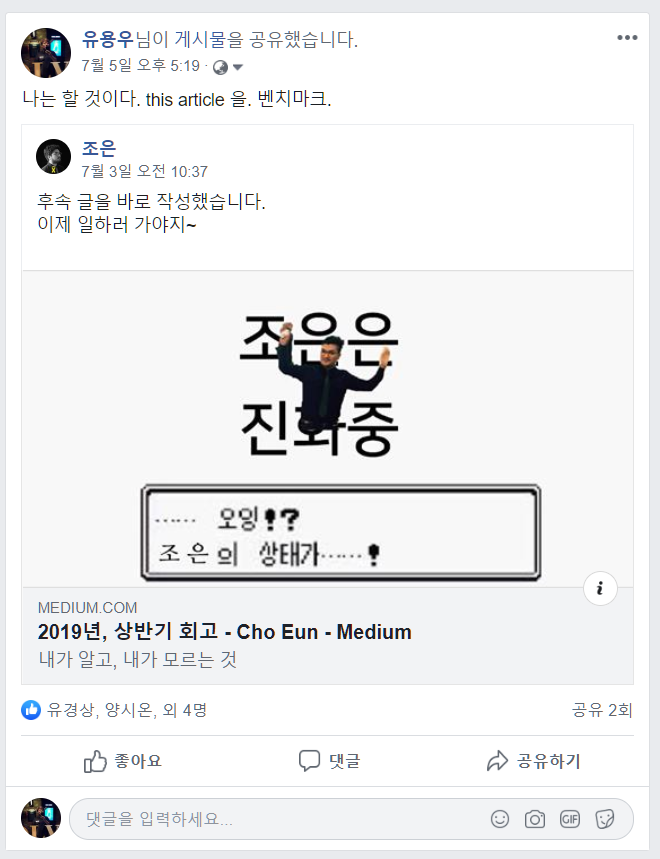 평소와 다를 바 없는 어느 출퇴근길에 역시나 평소와 같이 페이스북 타임라인을 눈팅하고 있었습니다. 그러던 중 조은님의 2019년 상반기 회고 글을 봤습니다. 2018년 회고 포스트도 작성 못 했던 터라 나도 간단하게 올해 상반기 회고만이라도 작성해보면 좋겠다는 생각이 들었습니다. 그래서 지금 시작합니다.