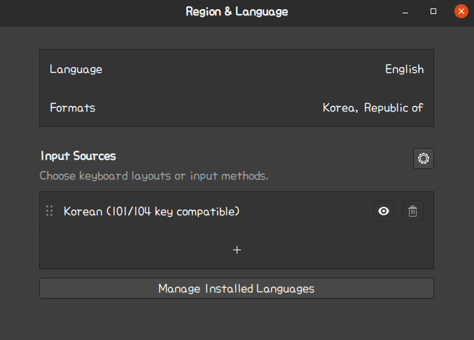 설정 - 지역 및 언어(Region & Language)에서 입력 소스(Input Source)를 한국어(101/104) 추가 후 영어(English)를 삭제합니다. (의미 있는지는 잘 모르겠음)