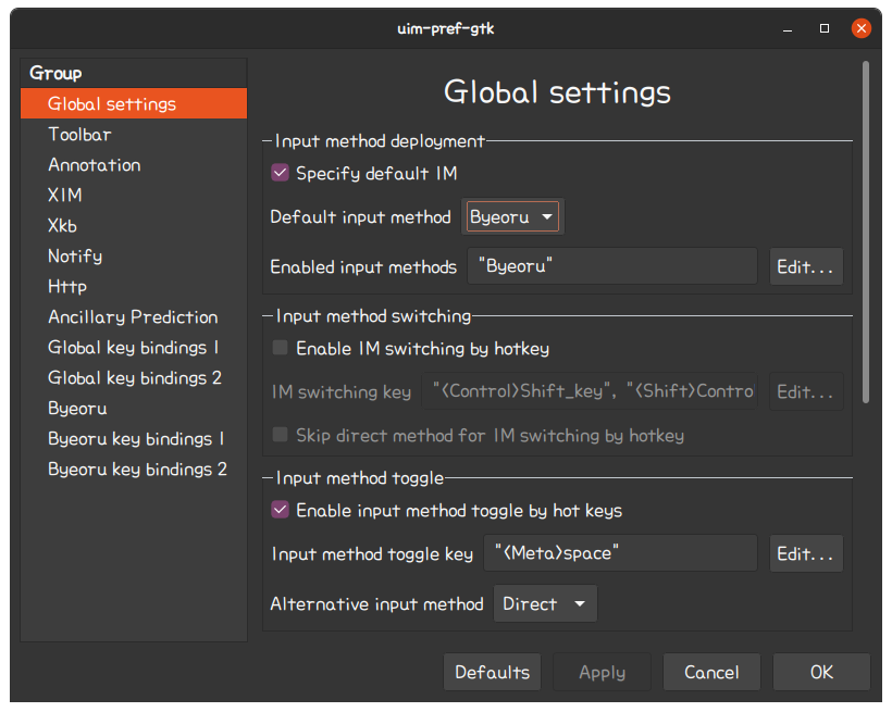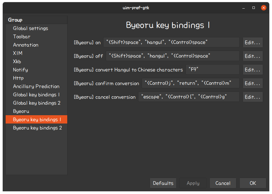 uim 입력기 설정의 벼루 키 설정 1(Byeoru Key Binding 1)에서 한/영키로 사용할 키를 잡아줍니다. 입력 소스를 한국어(101/104)로 설정했다면 오른쪽 Alt 키가 hangul 키로 잡힙니다.
