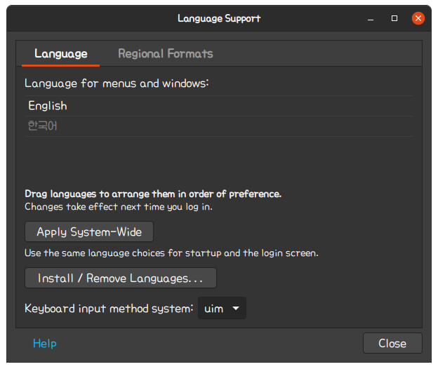 입력기 설정(Language Support)에서 기본 입력기 방식(Keyboard input method system)을 iBus 에서 uim 으로 변경합니다.