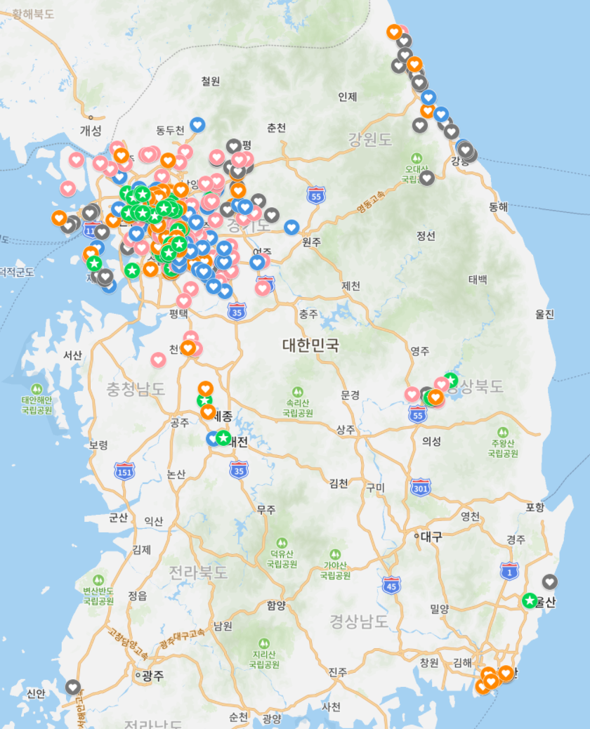 없으면 이래저래 불편하지만 있으면 얼마든지 써먹을 수 있는 게 자동차란 녀석이다. 가장 크게 느끼는 것은 차가 없었을 때의 나의 활동 반경은 지하철 역을 따라서 결정되었지만, 차가 생기고 난 뒤로는 주차가 가능한 어디던지 활동 반경으로 삼을 수 있다는 점이랄까. 2020년 11월에 차량을 인도받았고, 1년 1개월이 지난 오늘 시점에 약 15,000km 정도 운행했다. 평소에 가볼 만한 곳을 지도에 핀 꼽아놓고, 주말이나 시간 날 때 휙 다녀온다.