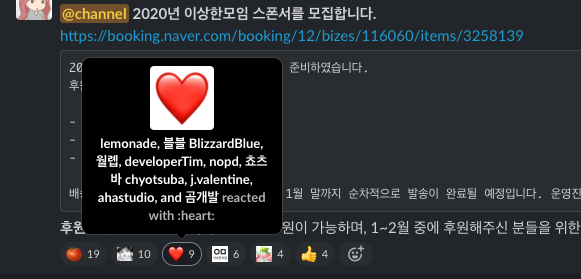 (요즘엔 이걸 지원하는 일반 메신저도 많아 졌지만) 어떤 공지형 채팅이 올라왔을 때, 무의미하게 '넵', '네', '넹' 으로 채팅방이 도배되지 않도록 해주는 강력한 기능이다. 단지 해당 메시지에 🆗 혹은 🤟 같은 리액션을 달아주면 그걸로 확인했다는 표시가 된다. 공지성 메시지에 반드시 리액션 할 필요는 없지만 '넵', '네~', '넹' 으로 도배되고 있는 채팅방을 보면 이모지 리액션이 그리워진다.