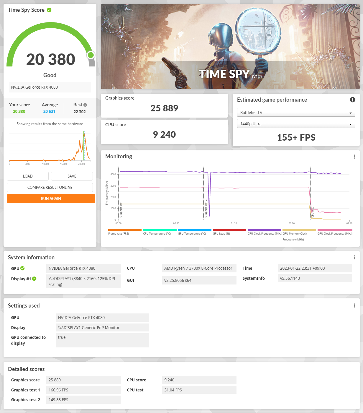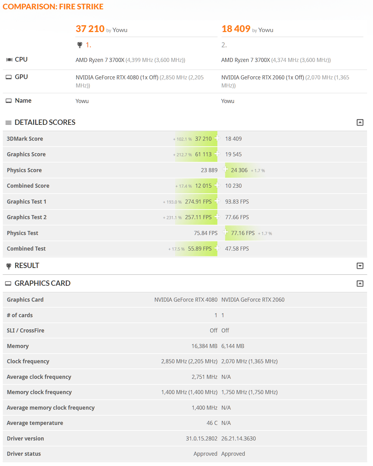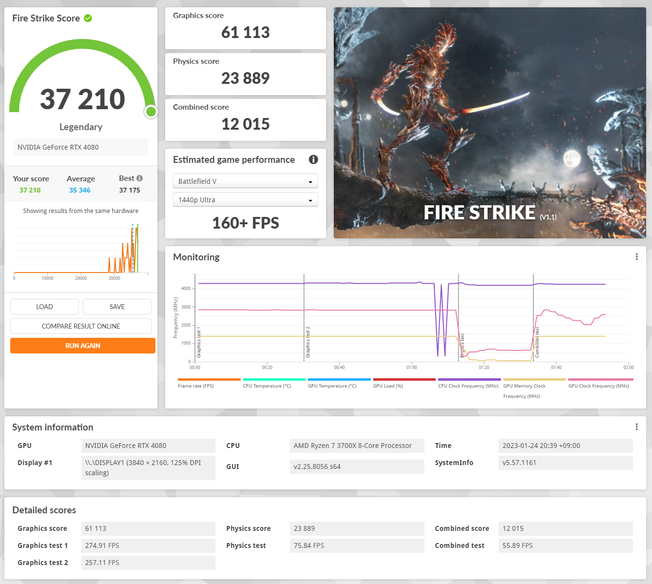 Fire Strike의 경우 약 37,000점을 기록했다. Fire Strike는 예전에 RTX 2060 벤치 기록이 남아있어서 비교가 가능했다. 전반적인 3DMark Score에서는 같은 3700X 임에도 약 2배 정도 점수 차이가 발생했고, 그래픽 성능만을 측정하는 Graphics Score의 경우 약 3배 정도 점수 차이가 발생했다.