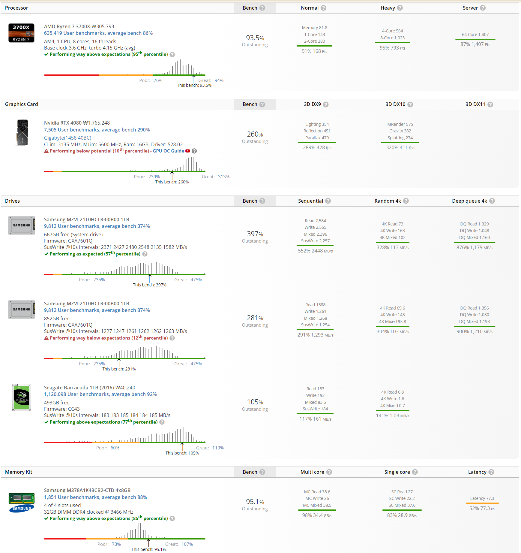 RTX 4080, PM9A1 with Ryzen 3700X 벤치마크