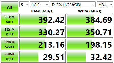 USB 3.2 Gen 2x1 (USB 3.1 Gen 2) C Type 연결 성능은 그럭저럭 나왔다. 최대 1250 MB/s를 제공해야 하지만 원래 이런 벤치나 성능은 스펙 대비 20% 정도 깎아서 보는 거다.