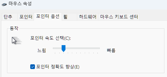 나는 포인터 정확도 향상(마우스 이동시 포인터 이동 가속 기능)을 켜놓고 사용하지만, 끄고 사용하는 사람도 많은 것 같다.
